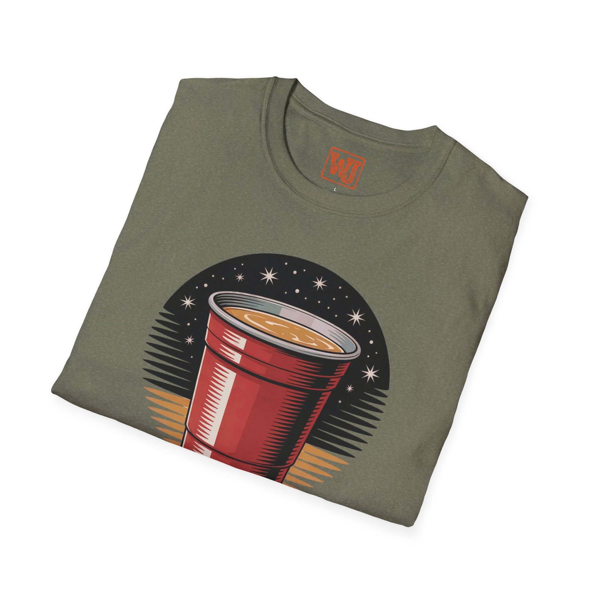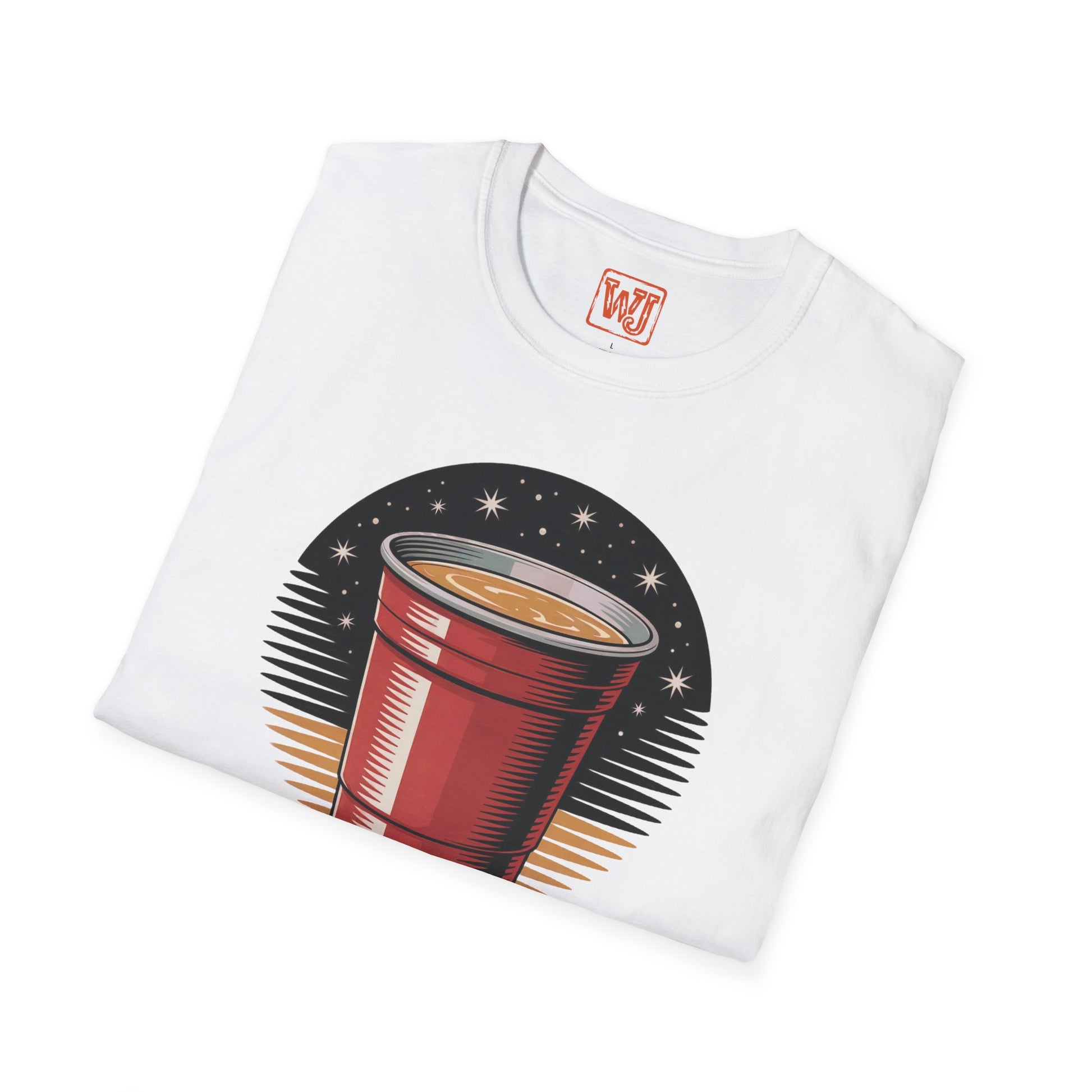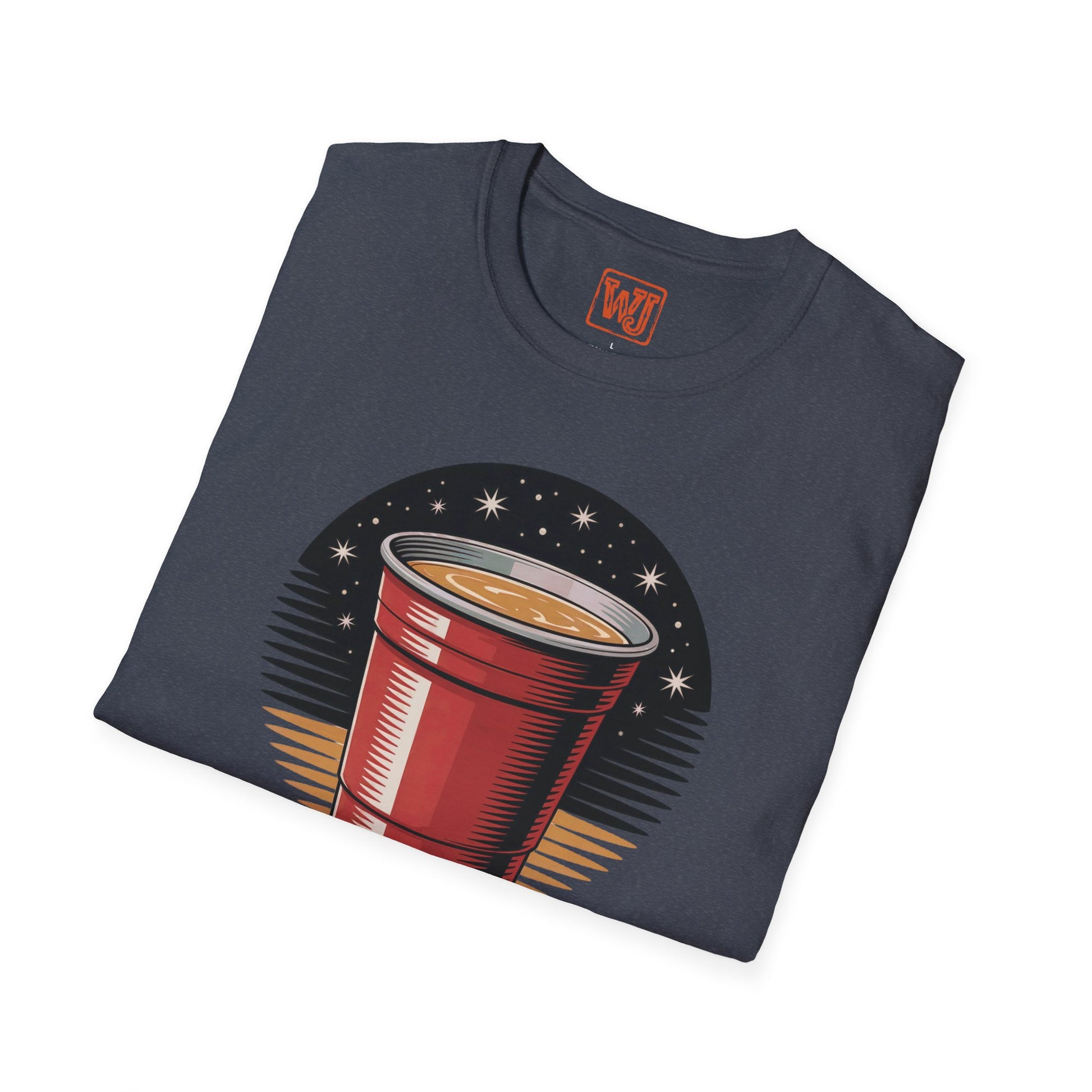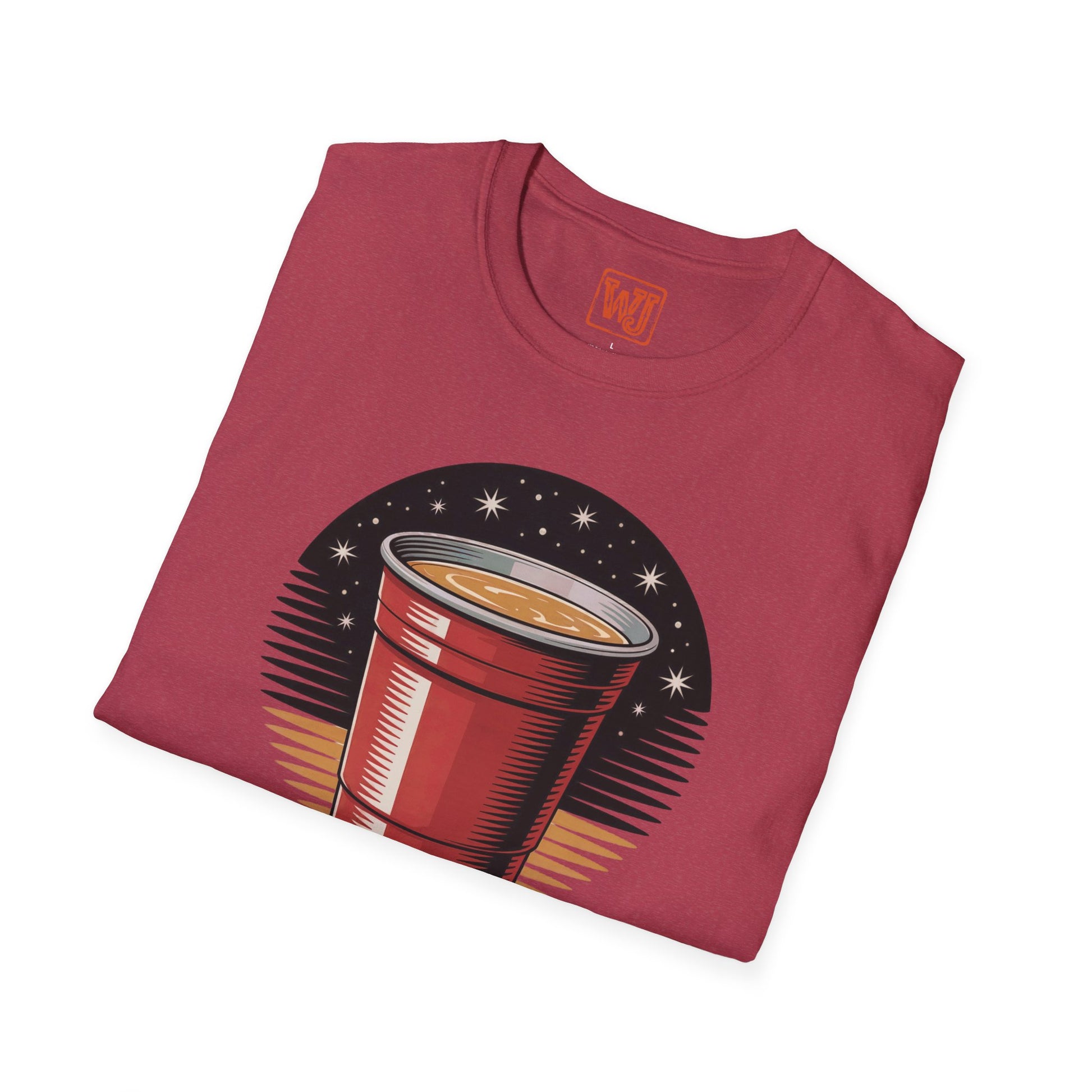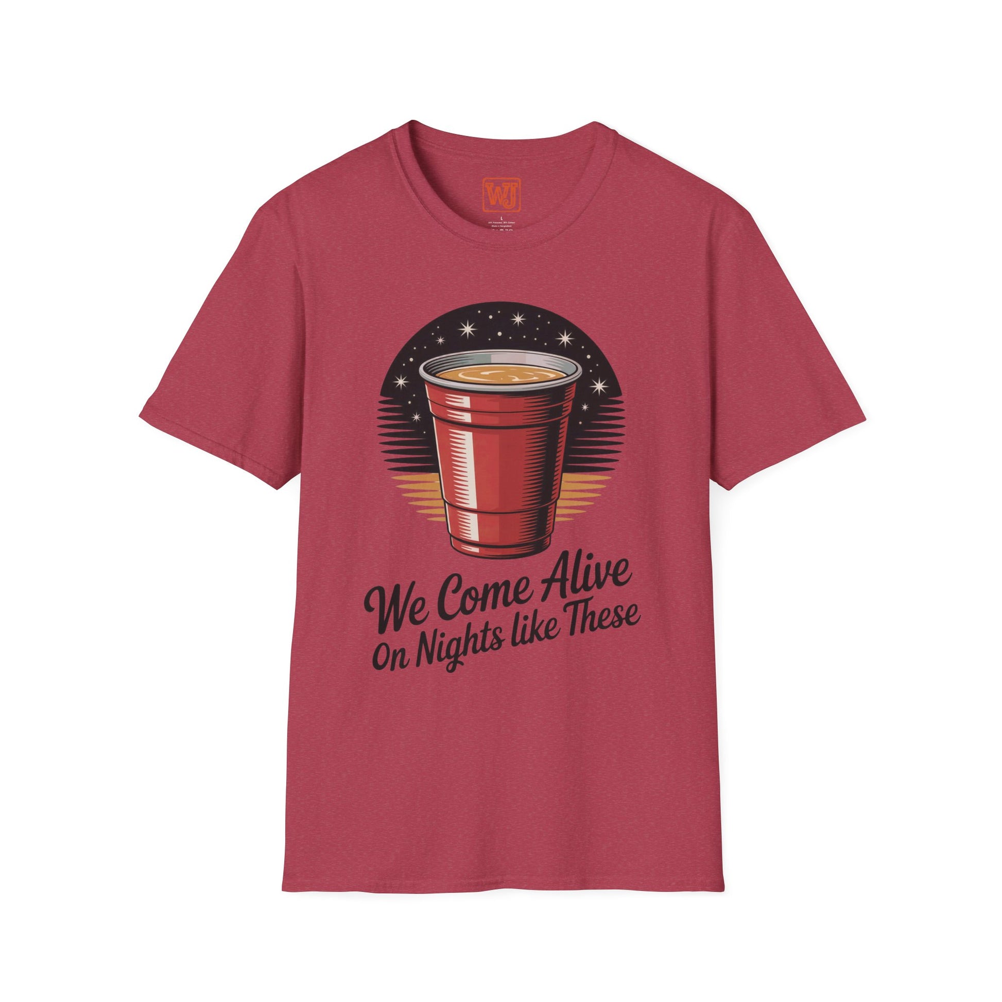 Country music-themed unisex T-shirt featuring a stylized red solo cup with a magical night sky effect, complemented by the text "We Come Alive on Nights Like These." The design captures the spirit of summer country gatherings, offering a fun and slightly sentimental vibe. Perfect for those who enjoy country music and summer parties, ideal for summer celebrations, music festivals, and casual gatherings.